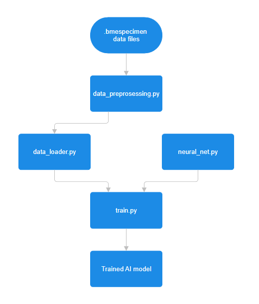 The workflow is orchestrated by train.py, the top-level script that executes the full pipeline from start to finish. It loads or preprocesses data as needed, initializes datasets and dataloaders, builds the neural network based on user-defined parameters, and runs the full training loop. After training, the script produces performance graphs, computes a confusion matrix, and saves the final trained model for deployment.