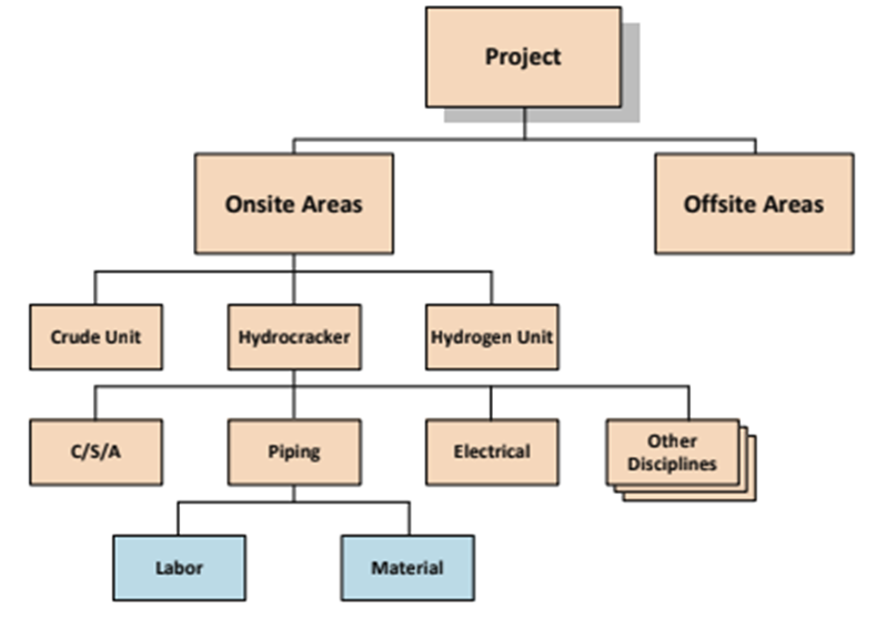 Kaavio 1. Tyypillisen teollisuusprojektin kustannusarviossa käytetty työn ositusrakenne (AACE. 2015. 121).