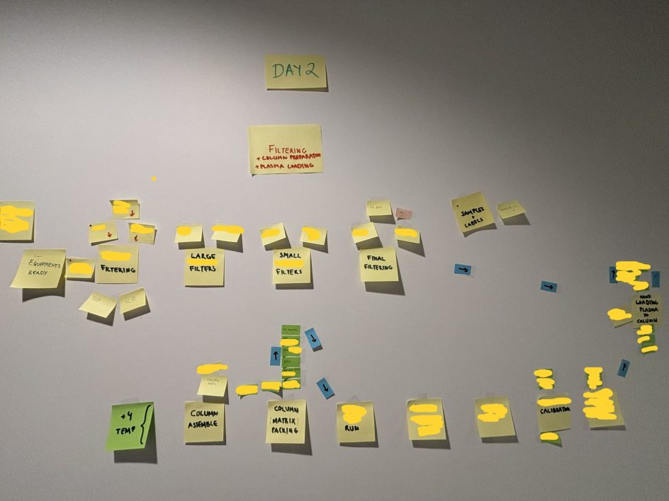 Laboratoriossa moni työvaihe jää helposti piiloon kiireen ja rutiinien keskelle. Kun plasmatuotannon prosessi tuotiin post-it-seinälle, siitä paljastui yksityiskohtia ja kuormituspiikkejä, joita oli aiemmin vaikea nähdä kokonaisuutena. Visuaalinen kartoitus osoitti, että avaimet prosessin kehittämiseen löytyivät lopulta pienistä muutoksista.