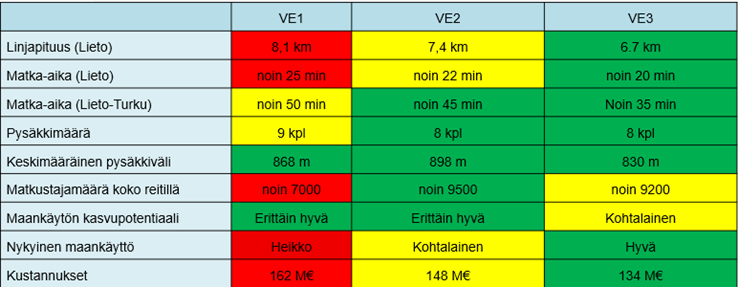 Raitiotien linjausvaihtoehdoista nousi esiin erityisesti kaksi kolmesta vaihtoehdosta, VE2 Littoinen-Loukinainen-Lieto sekä VE3 Turku-Lieto. Nämä erottuivat selkeästi nykyisen matkustajapotentiaalin ja maankäytön perusteella sekä tulevan maankäytön perusteella. Tulevaa maankäyttöä oli tutkimuksen aikaan suunniteltu melko lyhyellä aikavälillä vain vuoteen 2035 asti. Vaihtoehdon VE1 Littoinen-Suopohja-Lieto osalta ilmeni useampia haasteita, kuten nykyisen matkustajapotentiaalin selkeä vähäisyys.